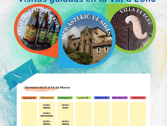 Guided tours in the Val d'Echo (Stories of the Pyrenees) Visit to the Monastery of San Pedro de Siresa and the old bread oven. Visit to the village of Echo and the ethnographic museum. Visit to the artisan brewery Pirineos Bier. Visit to the "Corona de los Muertos" site and the Selva de Oza dolmens. Information and bookings on the website www.historiasdelpirineo.com or via whatsapp at 629078513